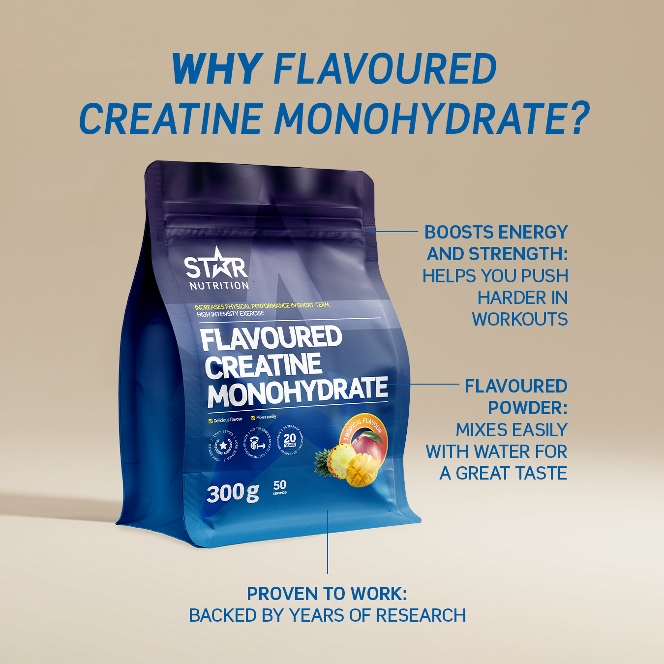 Star Nutritions Flavoured Creatine Monohydrate levererar kreatinmonohydrat i pulverform, med goda smaker som gör det enkelt att få i sig sin dagliga dos.